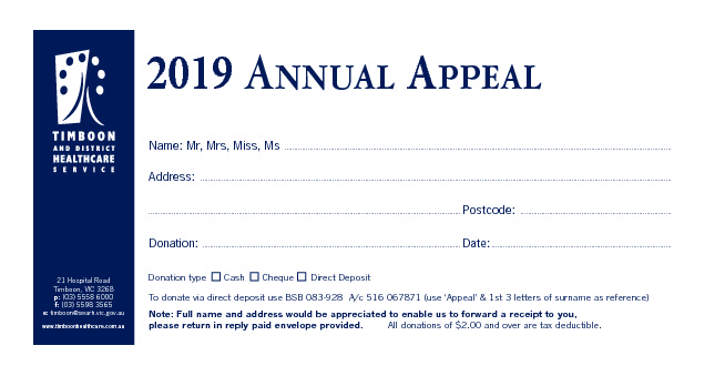 Patients, residents, staff and other carers will all benefit from the proceeds of Timboon and District Healthcare Service’s 2019 Annual Appeal.