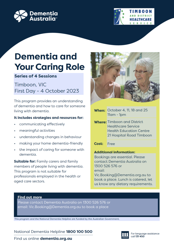 TDHS will be facilitating information sessions “Dementia and Your Caring Role” held by Dementia Australia at our healthcare service in October; see details in flyer below.