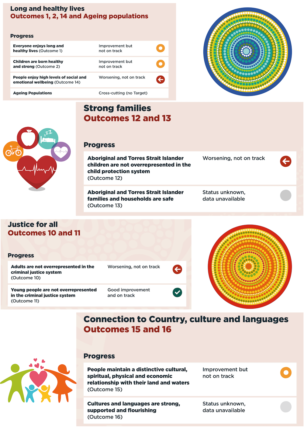 The Commonwealth Closing the Gap 2023 Annual Report and Commonwealth Closing the Gap 2024 Implementation Plan takes a new approach to the socio-economic outcome areas. Targets and outcomes have been grouped to reflect the need to develop actions holistically to advance the aspirations of First Nations people (Closing the Gap (niaa.gov.au))